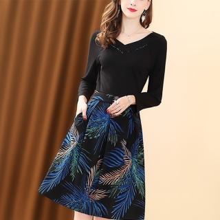 【FQ 時尚天后】黑上衣三色椰葉印花裙短洋裝(中大尺碼/S-3XL)