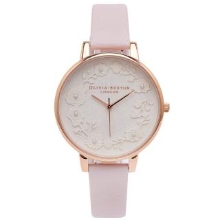【Olivia Burton】純潔浮雕花朵風皮革手錶-白面X粉紫色/38mm(OB16AR01)