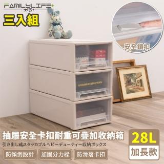 【FL 生活+】加長款-抽屜安全卡扣耐重可疊加收納箱-28公升(超值3入組)