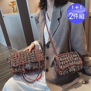 【Abigail】新款毛呢格紋繡線晚宴包肩背包斜背包大小包二件組6113(二件組-彩虹)