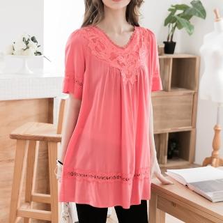 【MsMore】日系復古典雅蕾絲刺繡絲感長版上衣101599現貨nz(珊瑚紅)