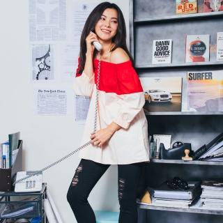 【Who Cares】撞色露肩七分袖長版上衣(紅粉)