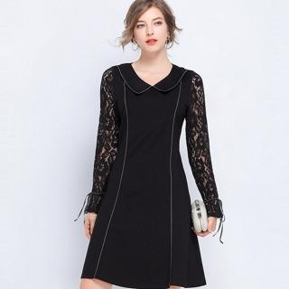 【A’bella 艾貝菈】氣質黑蕾絲長袖綁結喇叭袖洋裝(中大尺碼/L-5XL)