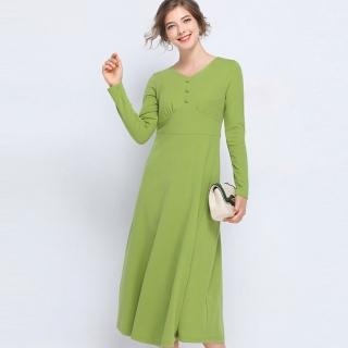 【A’bella 艾貝菈】草綠三粒飾釦棉素面長洋裝(中大尺碼/L-5XL)