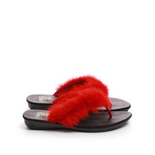 【FNACE】貂毛歐美隨興風.皮草元素鑲鑽設計夾腳軟底拖拖鞋(紅色)
