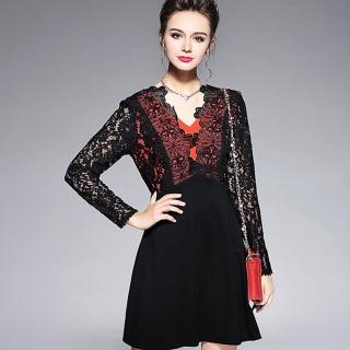 【A’bella 艾貝菈】V領黑紅蕾絲後背綁帶短洋裝(中大尺碼/M-5XL)
