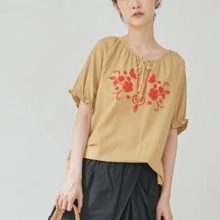 【慢。生活】綁繩領刺繡棉麻上衣-L/XL(黃)