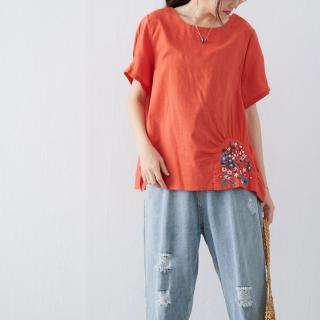 【慢。生活】抓皺刺繡棉質短衫-F(紫/橘)