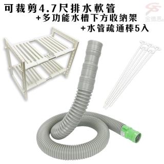 【金德恩】可裁剪4.7尺排水軟管+多功能水槽下方收納架+水管疏通棒5入(出清.SALE)